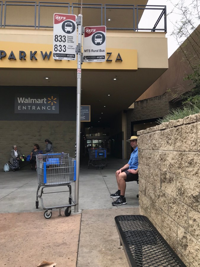 Our Uber driver dropped us off at the El Cajon Mall, we ate Rubio’s Coastal Grill, then walked around and sat on benches waiting for our 3pm bus ride to Campo. The Parkway Plaza Transit Center was conveniently located just outside the south entrance of the mall. Before we knew it we were huddled into a bus with a dozen or so other passengers, mostly older Hispanic mothers with grocery bags, with our packs squished in front of our seats. We made a few stops for local students in their early teens and had a full bus with standing room only until we reached Tecate where most people disembarked. After another 30 minutes or so the bus driver helpfully reminded us about our stop and dropped us off at the Campo general store.