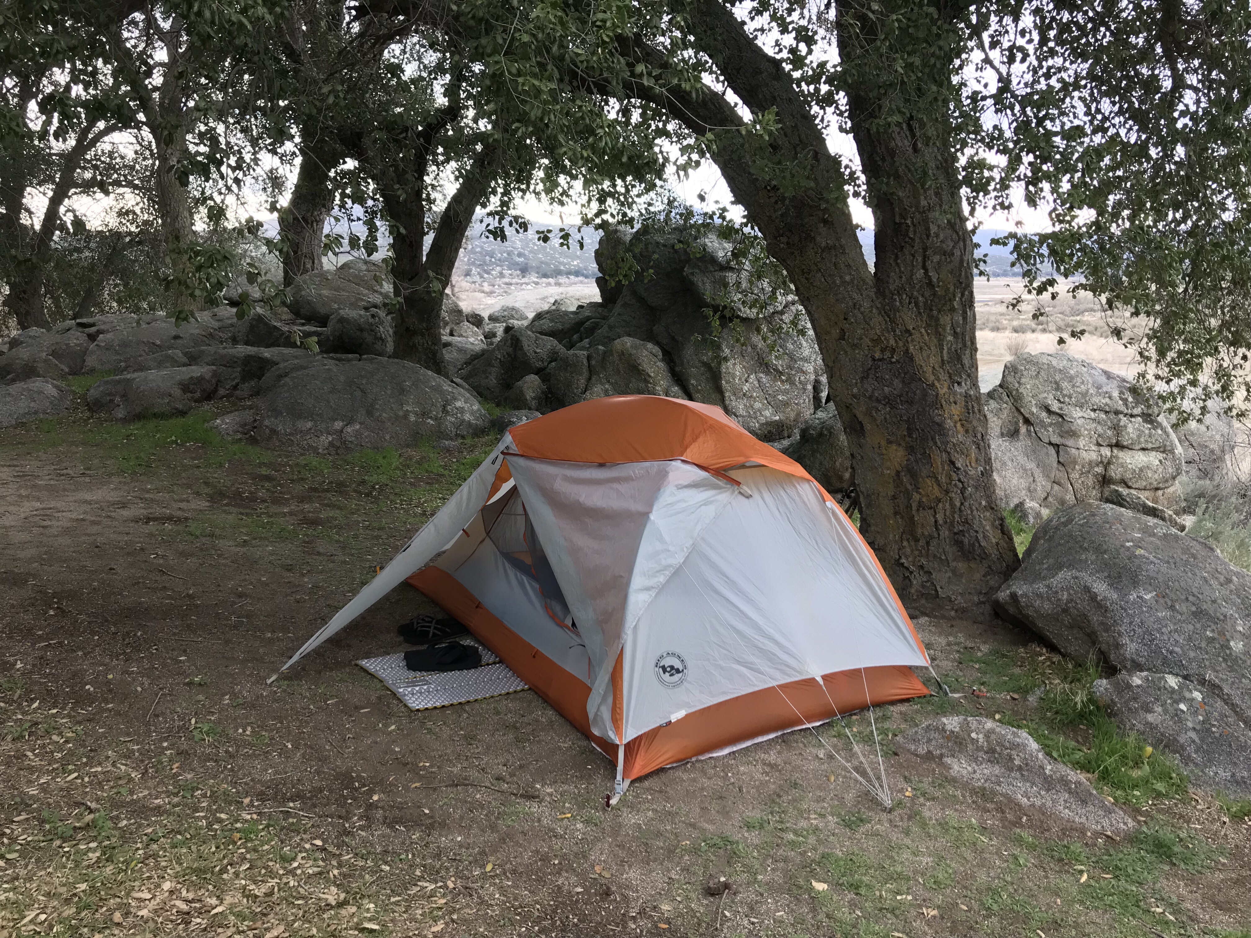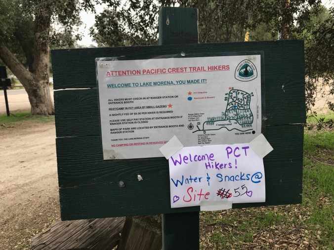 When we got to Lake Morena Campground we had our first trail magic from a guy named Possum, a Vietnam veteran originally from New Orleans but living in Birmingham the last 40 years. He had an RV set up and told us in his partly Cajun partly southern accent to help ourselves to the free water, snacks and outlets, and he can give a ride to the restaurant/convenient store. Elise still had 1 liter of water left, but we helped ourselves to some snacks and said hi to Bible who was exchanging bills for quarters to shower. We also got some quarters to shower and then set up our tent in the PCT hiker section up a hill behind some large boulders overlooking the flat plains and lake.