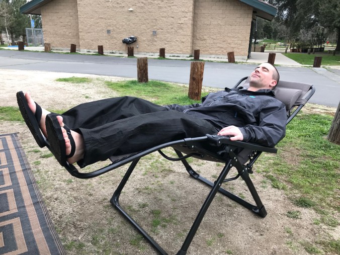 It started to rain a little while we sat under the RV’s awning and discussed our plan for the next day, which consisted of taking a zero and waiting for Marcel’s chaffed…area…to heal. To our surprise, Possum went in the RV and came back out with a couple tablespoons of coconut oil in a ziplock bag. A little skeptical of it’s healing properties, we took the oil and thanked him. We ended up staying until dinner time and were just about to go to our tent to cook when this generous man went in the RV again and offered us macaroni vegetable soup. Sitting with this kind stranger with some country music playing in the background, we sipped hot chocolate and slurped up the soup. It was around 8ish (hiker midnight) when we thanked Possum for everything and slinked off to bed.